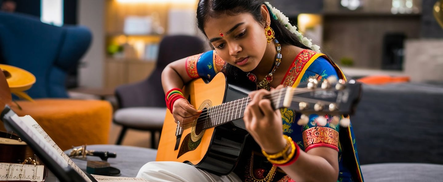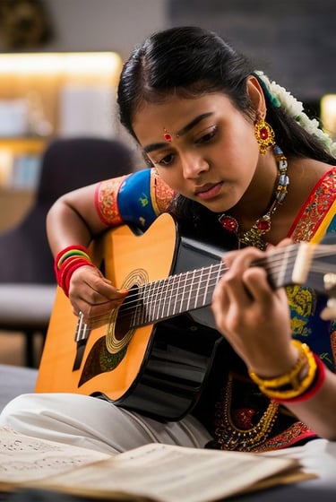 Learn scales, chords, and rhythm in both Indian and Western styles.